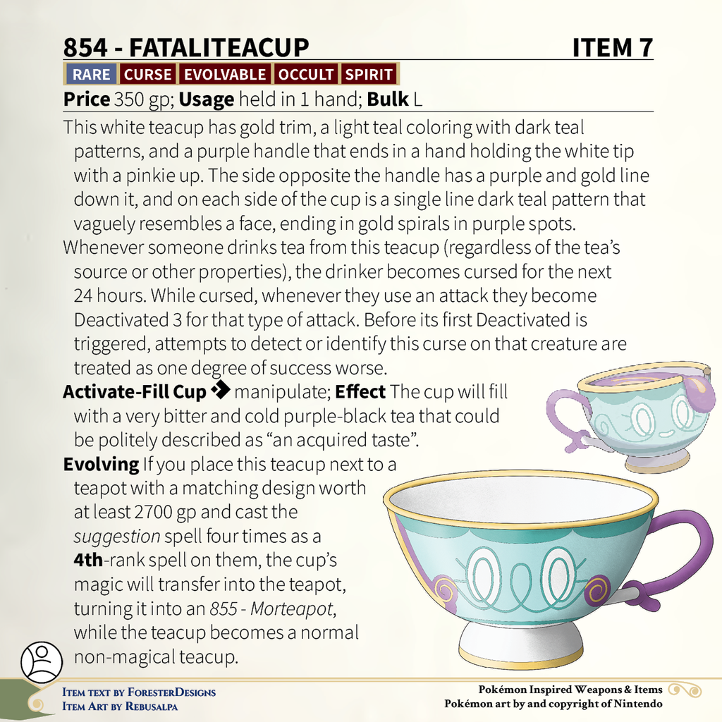 A #PF2e conversion of my older #Pokemon #MagicItems, with a #Sinistea #teacup to serve some cursed tea