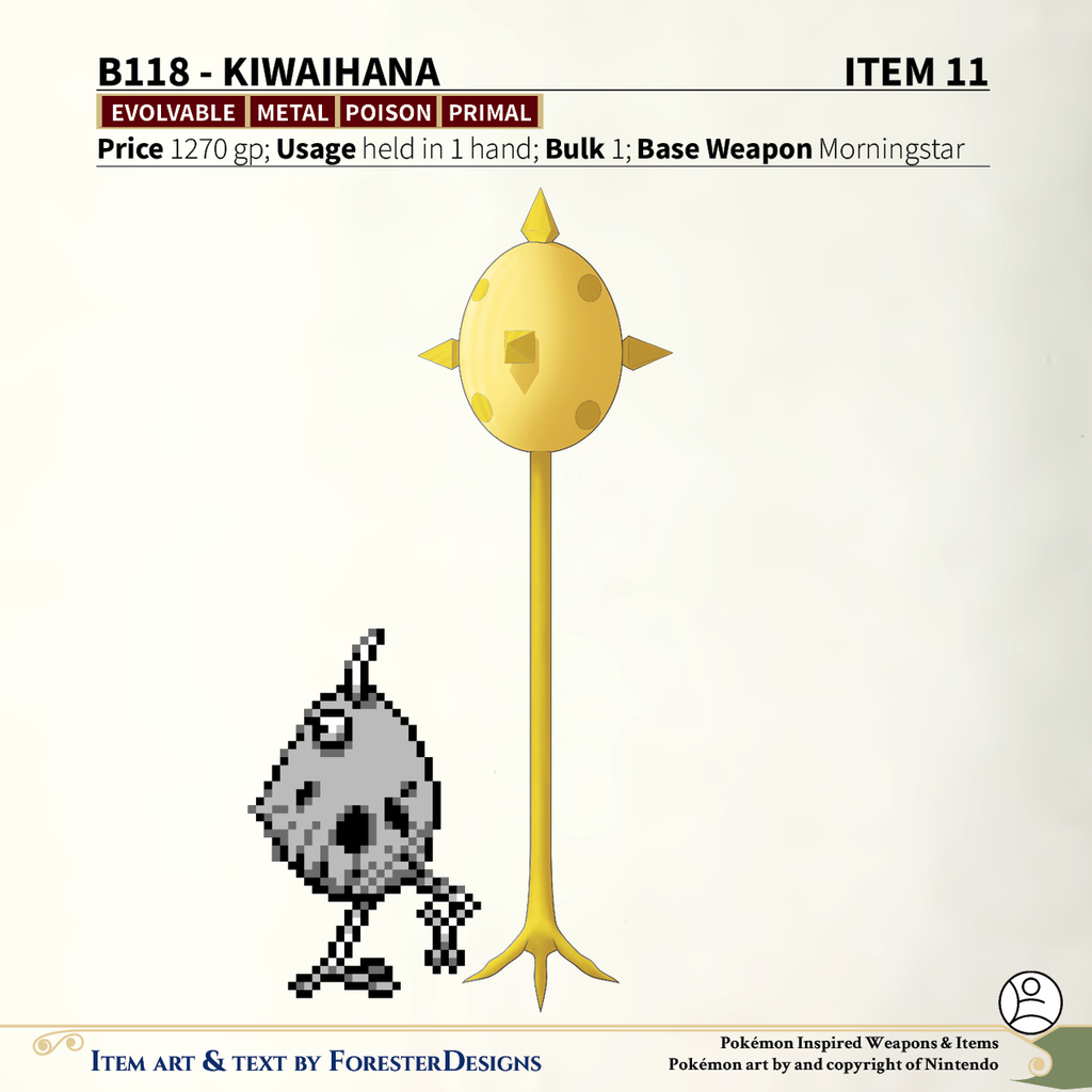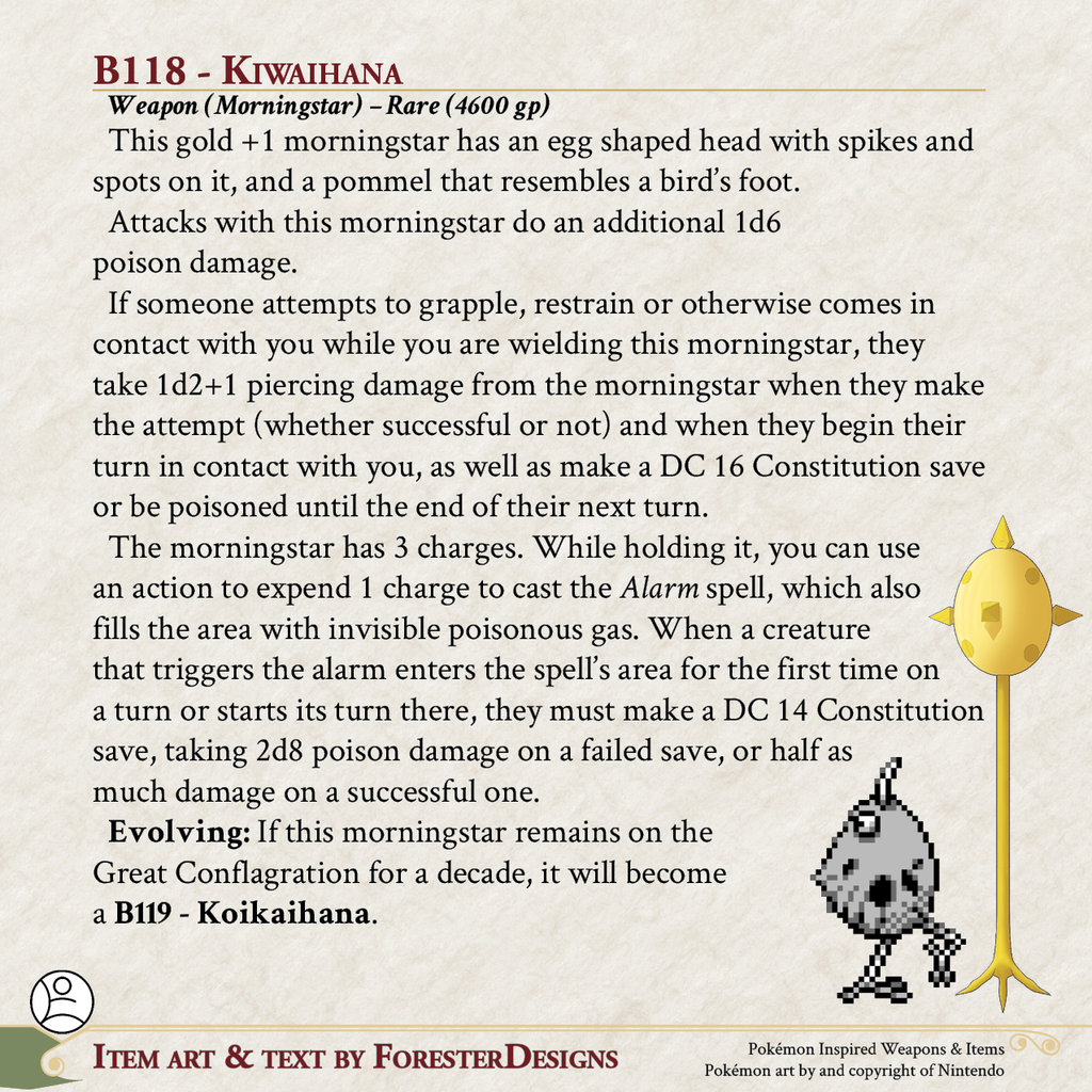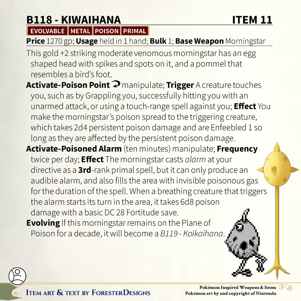 My #TTRPG #Pokemon #MagicItem of the Day in both #DnD and #PF2e, with a #Kiwi #morningstar to poison the uninvited!