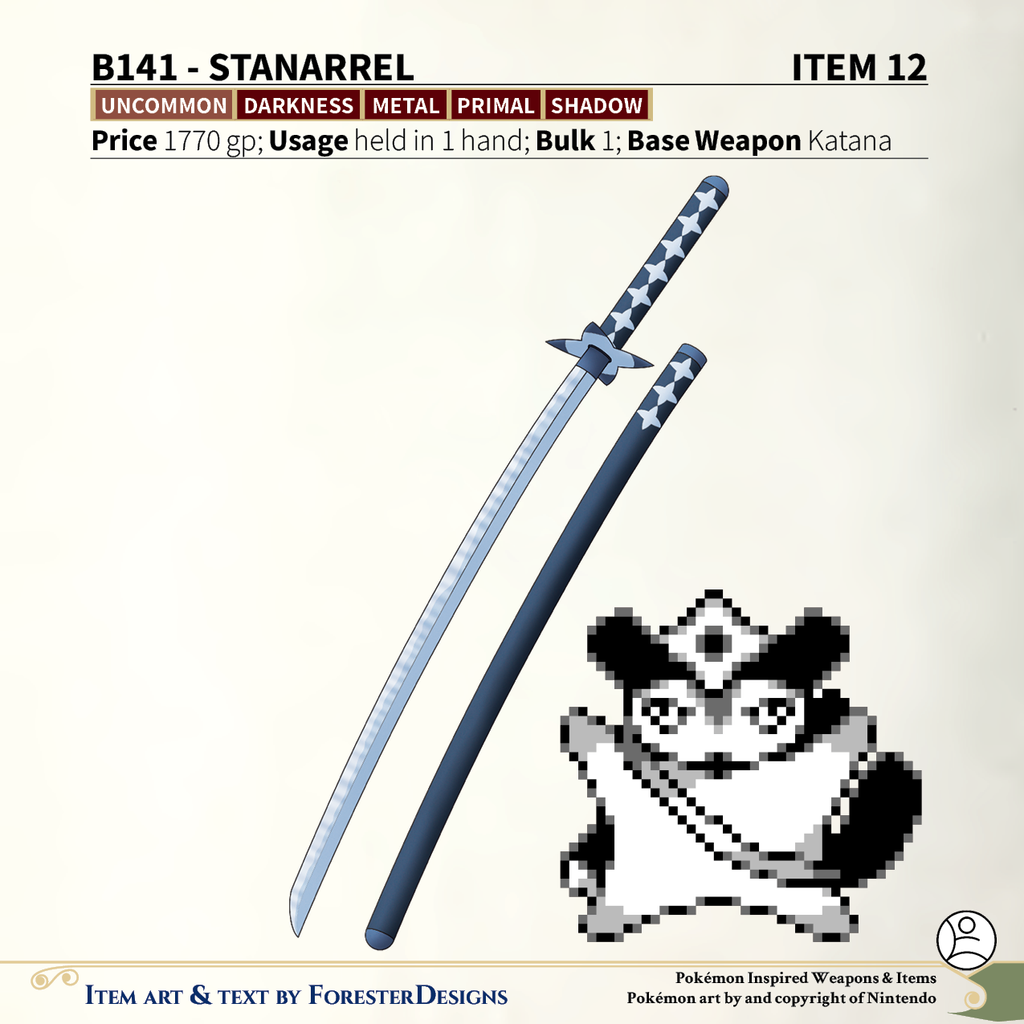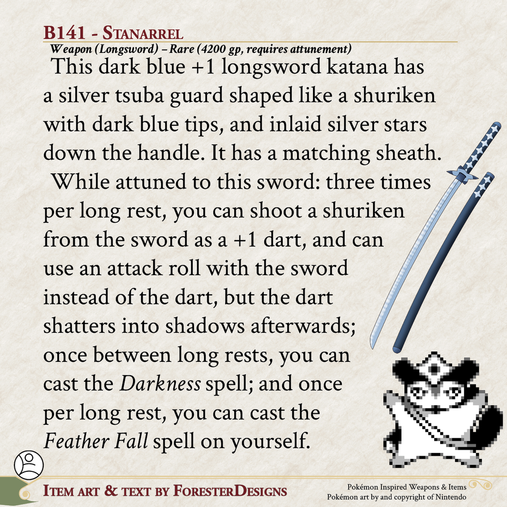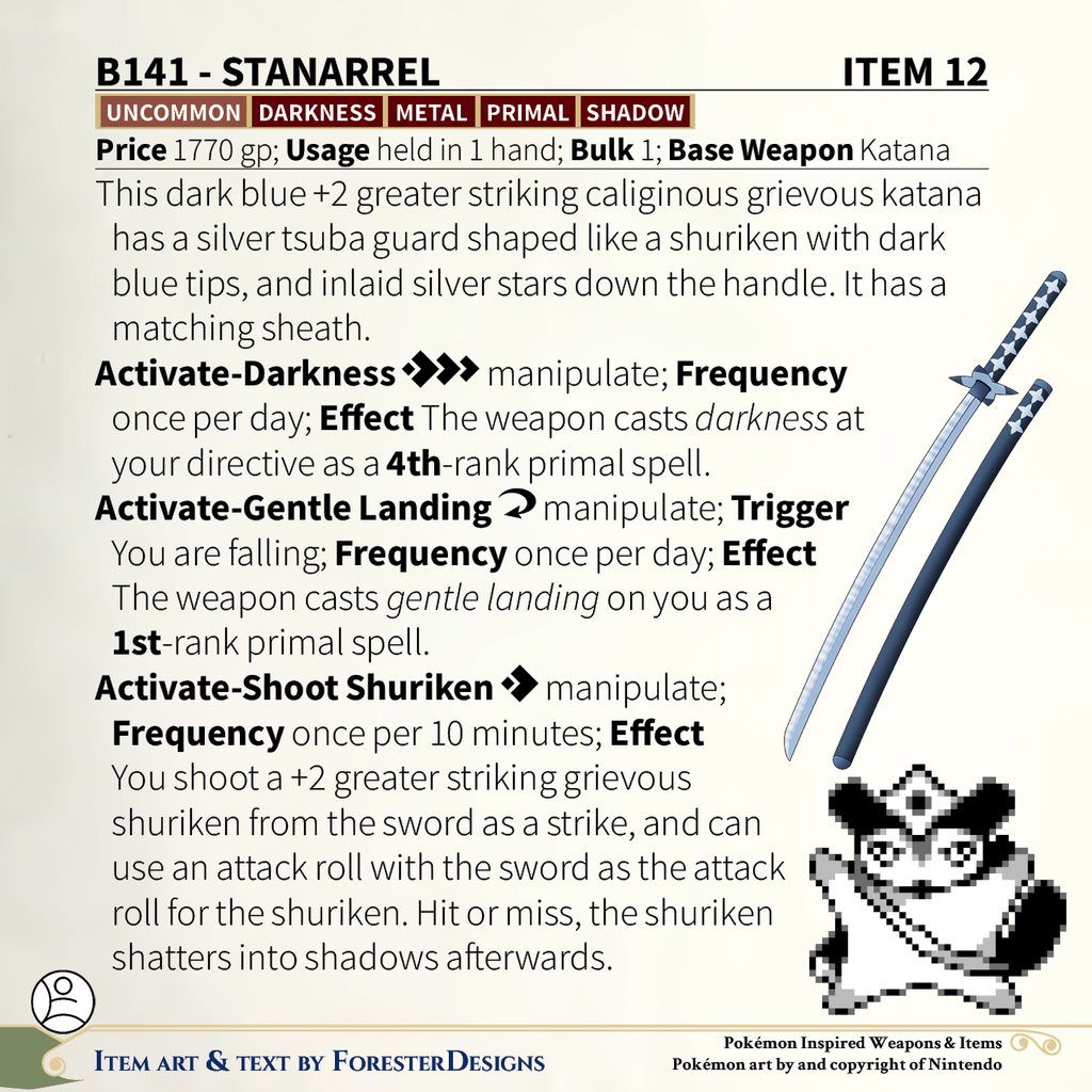 My #TTRPG #Pokemon #MagicItem of the Day in both #DnD and #PF2e, with a #Starrel #katana to shoot shurikens from the darkness!