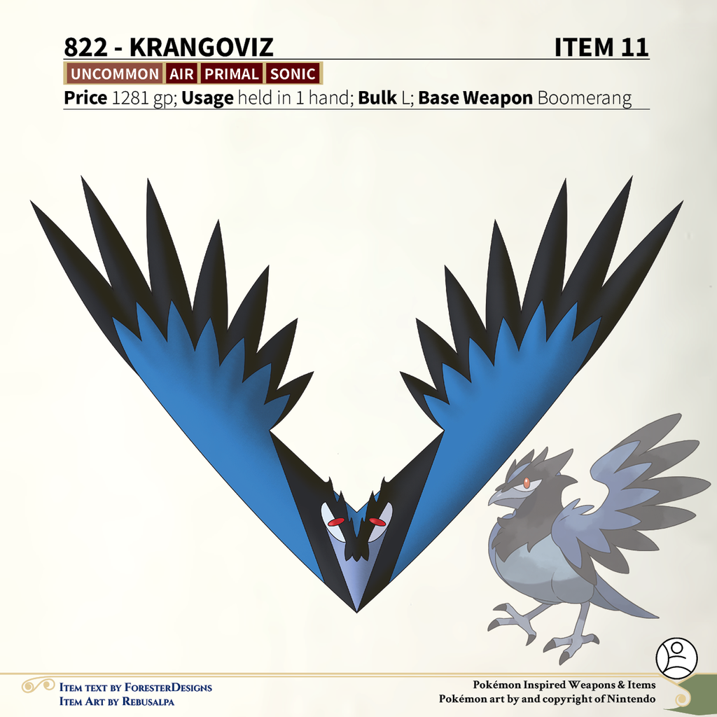 A #PF2e conversion of my older #Pokemon #MagicItems, with some #Rookidee & #Corvisquire #boomerangs to listen to crows' whispers!