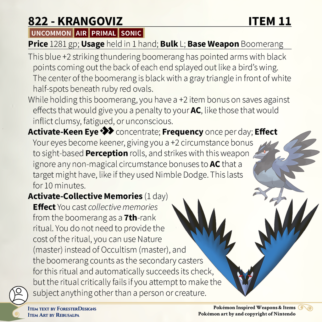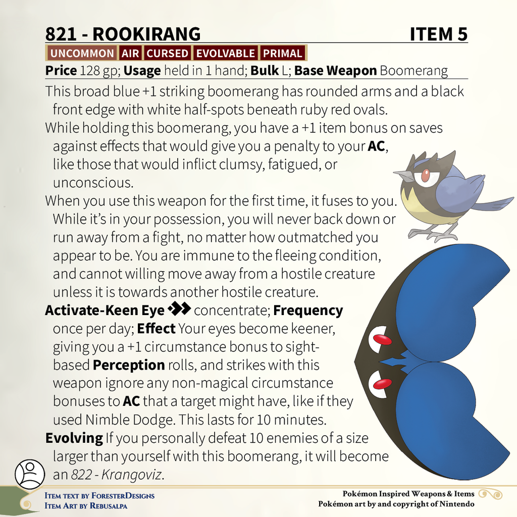 A #PF2e conversion of my older #Pokemon #MagicItems, with some #Rookidee & #Corvisquire #boomerangs to listen to crows' whispers