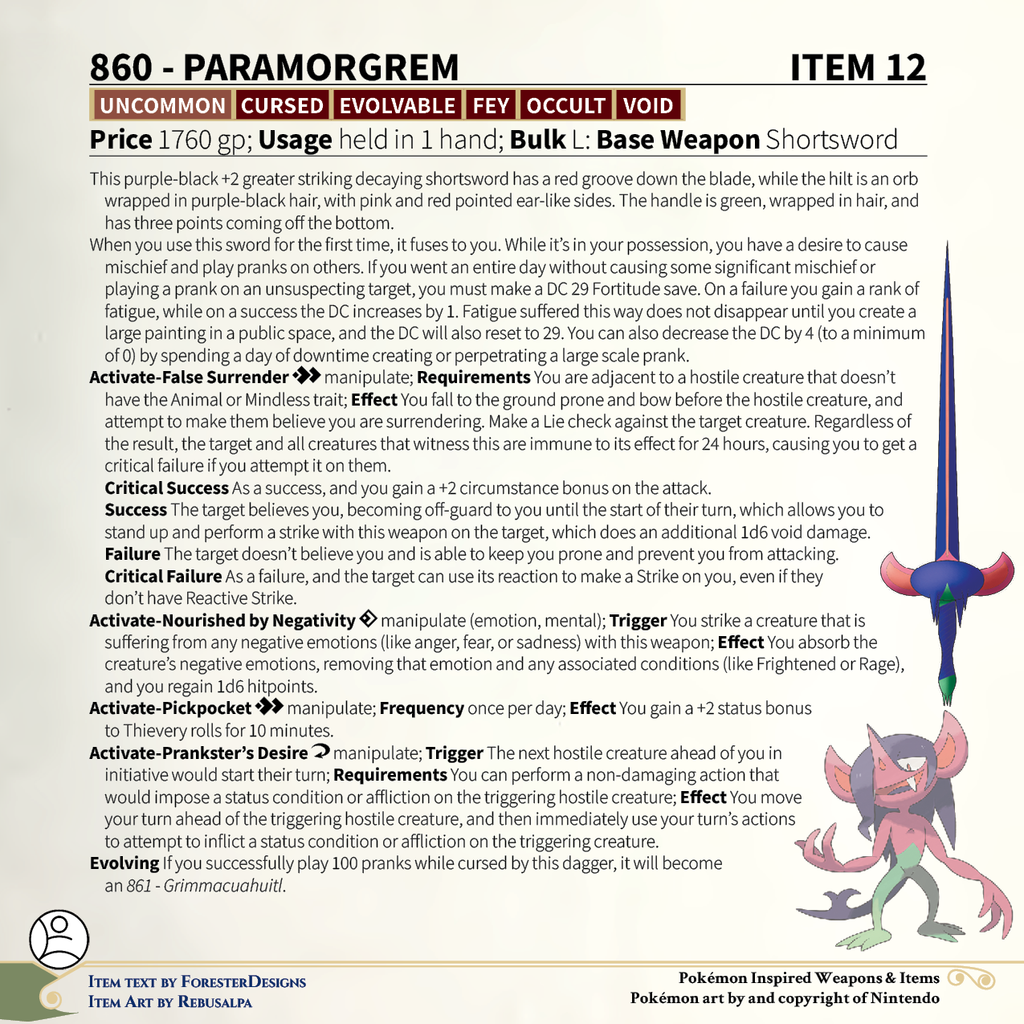 A #PF2e conversion of my older #Pokemon #MagicItems, with a #Morgrem #shortsword to give a false surrender!
