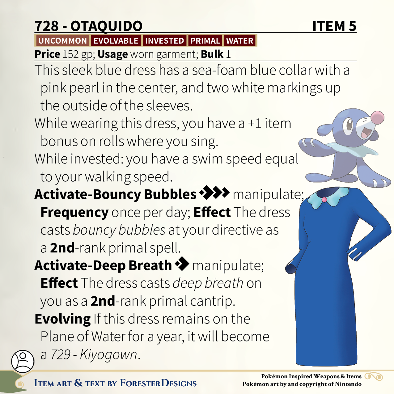 3. A #PF2e conversion of my older #Pokemon #MagicItems, with a #Popplio #dress to spread bouncy bubbles!