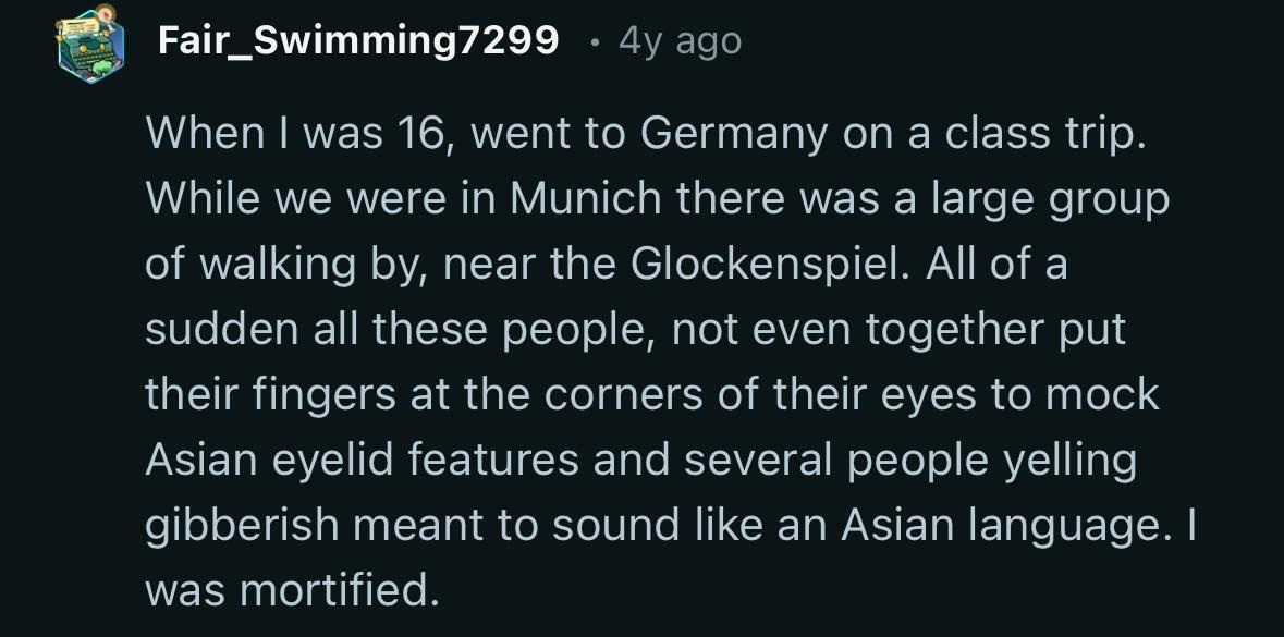 Also, many ‘normal’ people defend that type of behavior. They’ll be like ‘oh what were you expecting, bunch of Asian kids standing around TOGETHER just asking for it’