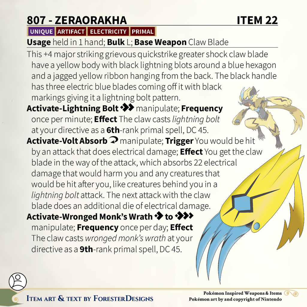 A #PF2e conversion of my older #Pokemon #MagicItems, with a #Zeraora #claw blade to strike like lightning