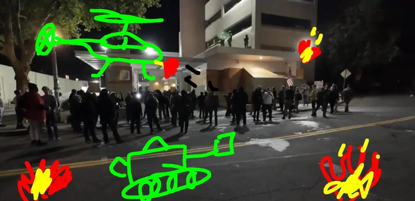 Credit to /u/Im_so_little/ for this light edit showing the war zone outside the Portland ICE facility.