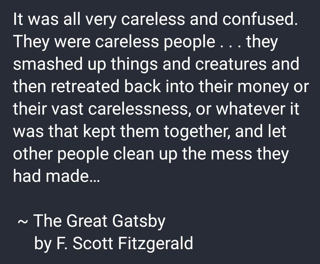 Someone on another platform shared this quote, with the implication that it reflected the mindset of tech executives pushing the current LLM/AI bubble.To my thinking, it was equally relevant to all folks in positions of wealth and power subjecting the rest of us to their whims, because some idea strikes their fancy at the moment.#Gatsby #LLMs #Techbros