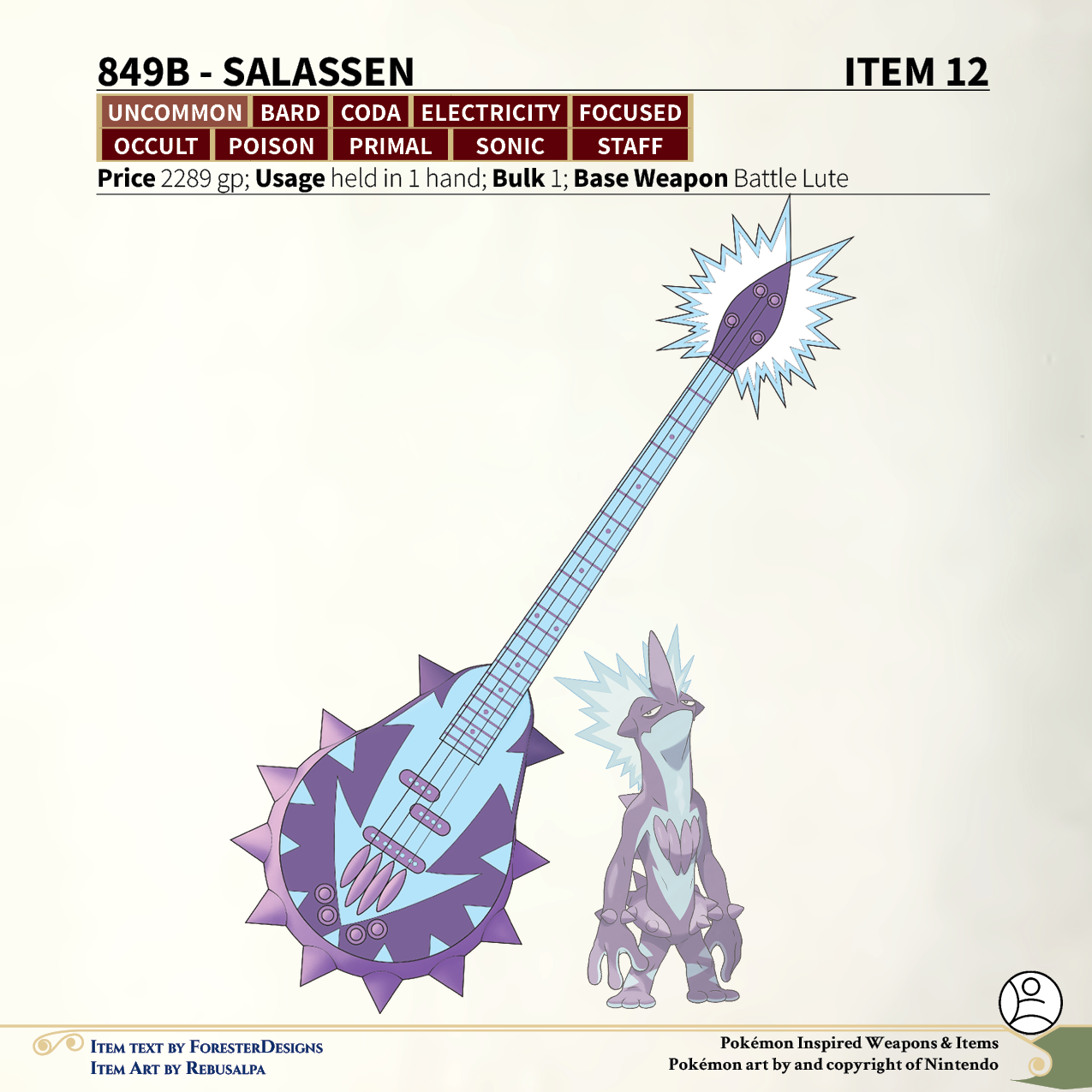 A #PF2e conversion of my older #Pokemon #MagicItems, with a Low Key Form #Toxtricity bass #guitar to make your audience noxious, & a #Sizzlipede #spikedchain to blow some smoke!