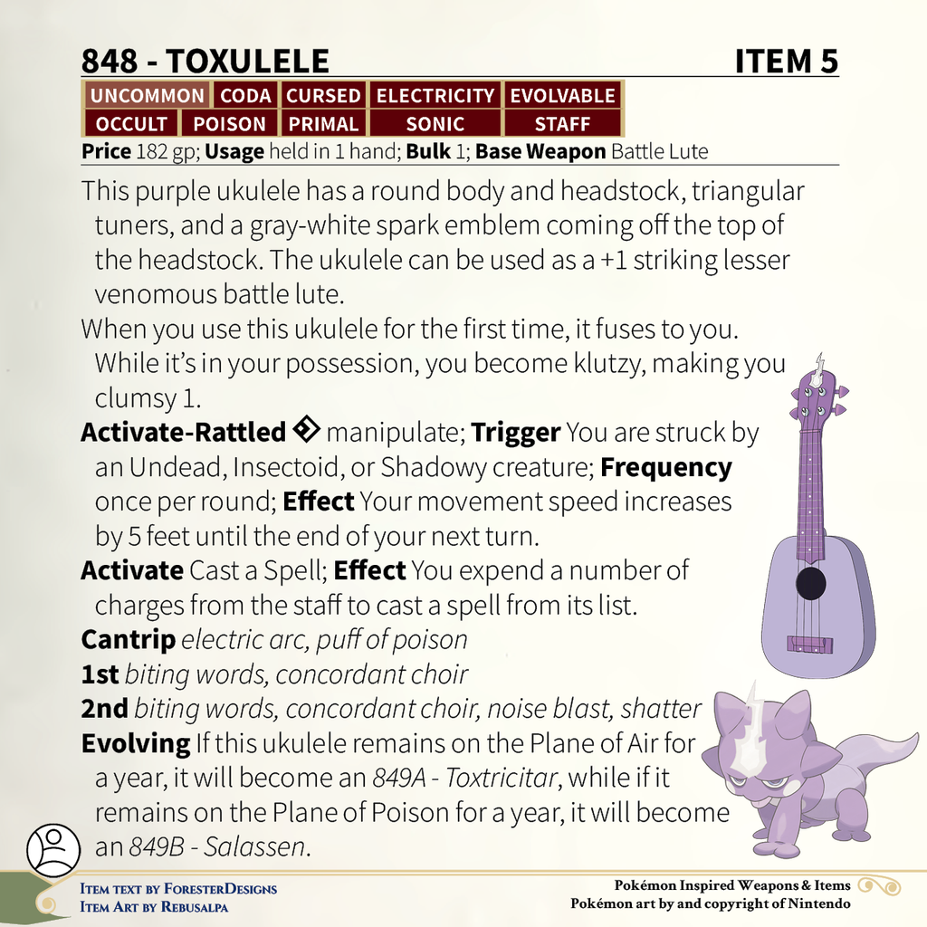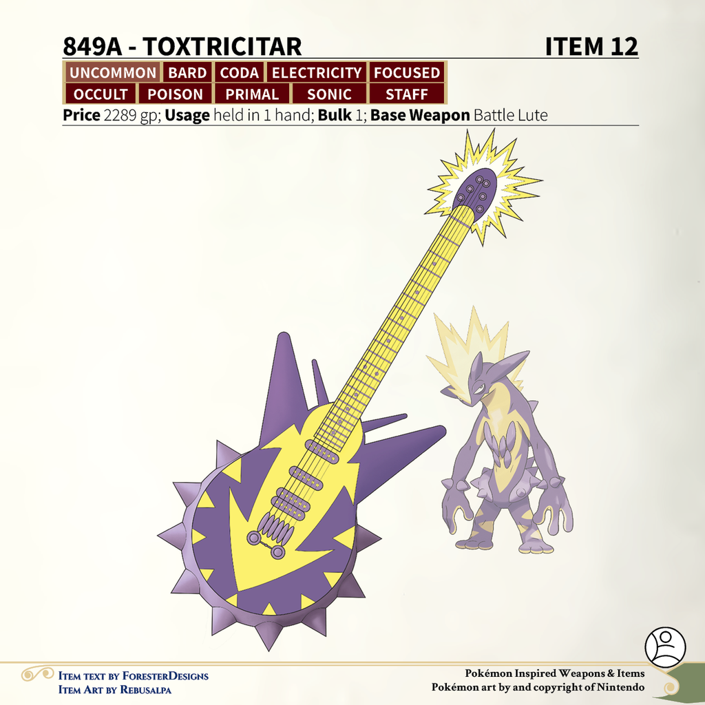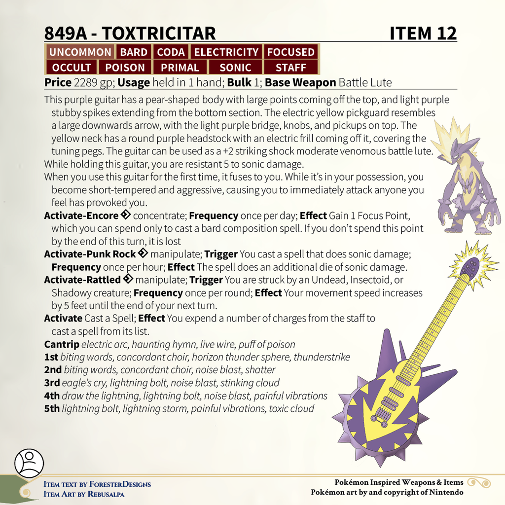 A #PF2e conversion of my older #Pokemon #MagicItems, with a #Toxel #ukulele & Amped Form #Toxtricity #guitar to shock your audience!