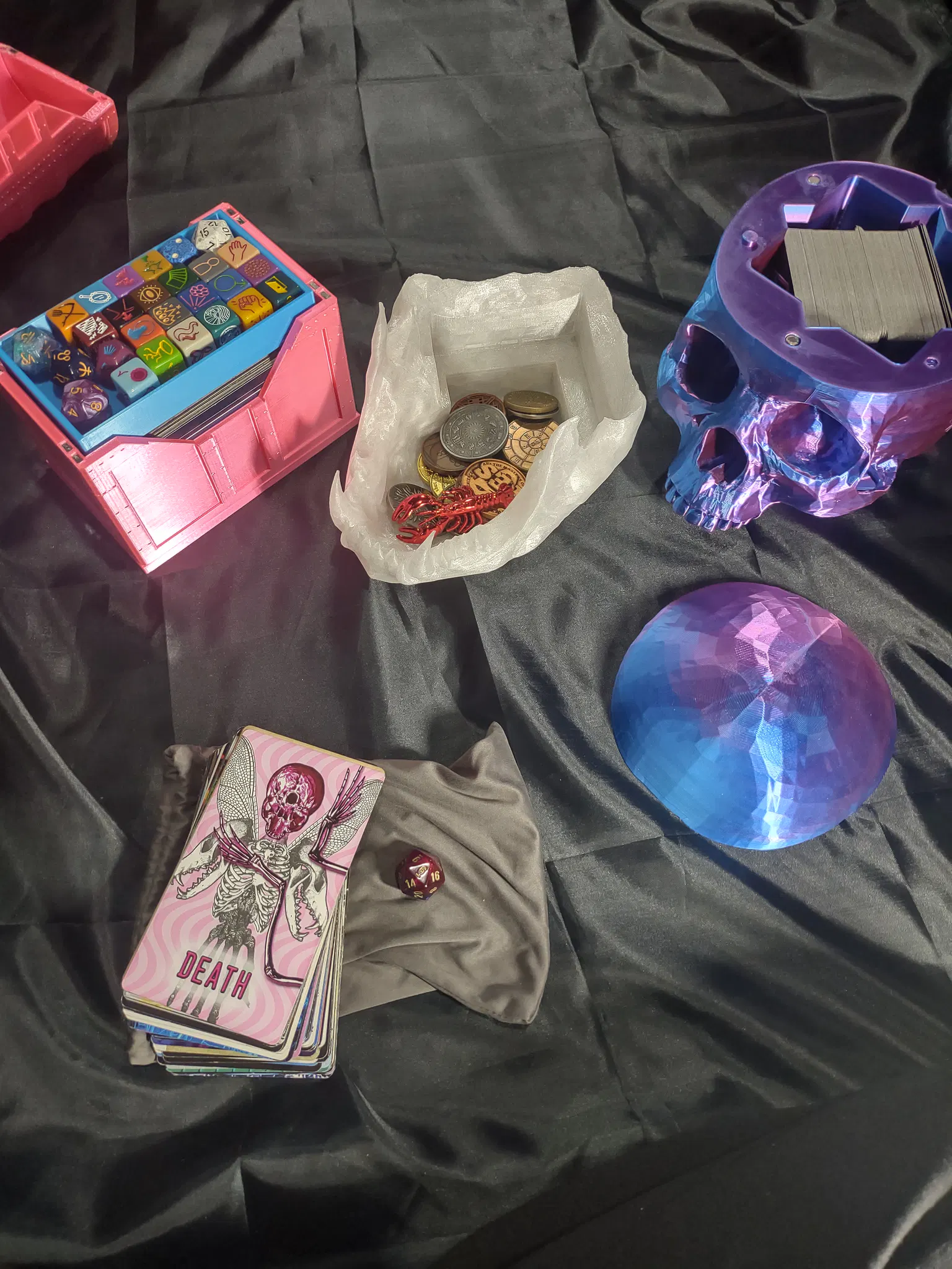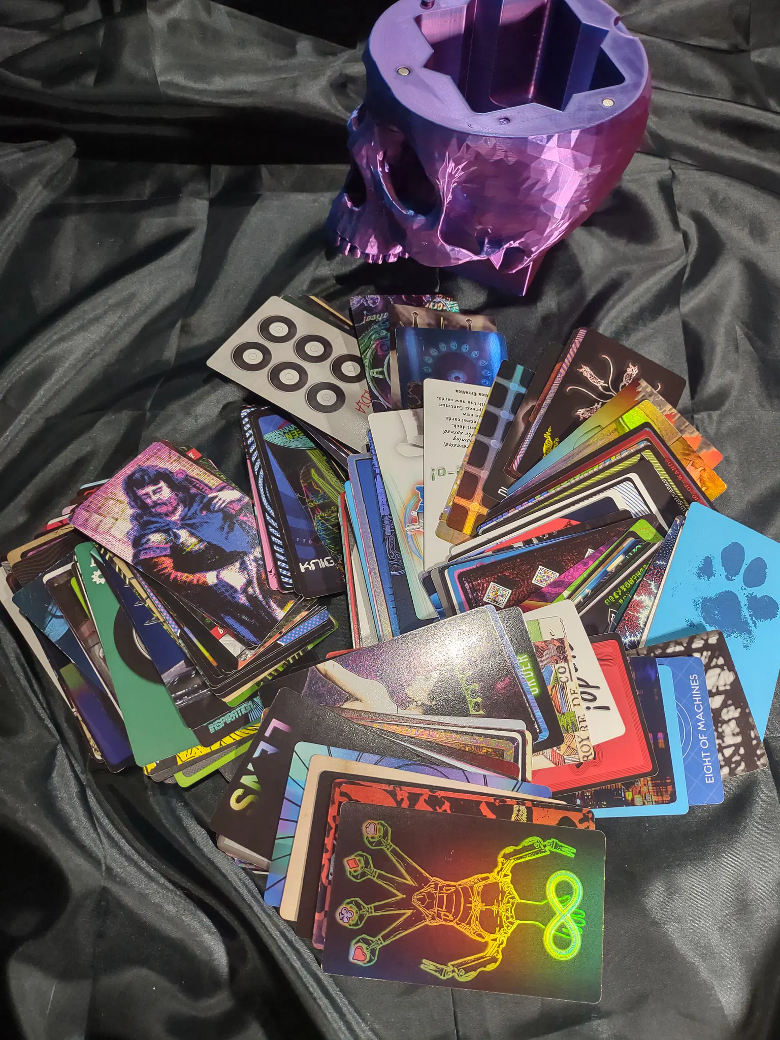 So it's a #MagpieTarot style deck, with each card having it's original card back replicated as well. The AlleyWAY tarot and the two oracles are recreations of three other decks "found" in the lore, also with unique card backs (Fun fact, a Cryptica card appears in the Alleyway tarot and another one is in the Oracle of Play). So I put my open copies of all these into a single card pool, and constructed myself a magpie of only Publishing Goblin cards. In the second picture, the closeup of the card edges, the stack inside the cloth lined container are the leftovers, and the pile standing up against the side of the container is the magpie I compiled out of it. Much like a TCG player, I'll sometimes tear down and rebuild a magpie deck out my personal card stash (I've got a separate stash of non-pub-gob cards for rearranging my personal magpie that lives in the hot pink chest). And then of course some example cards from my curated deck, and a card back spread are the third picture.