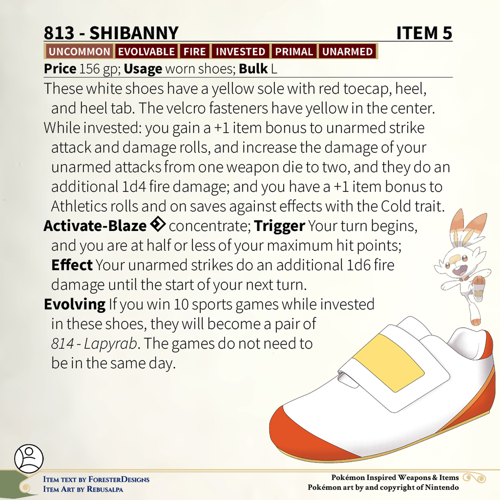 A #PF2e conversion of my older #Pokemon #MagicItems, with some #Scorbunny #shoes to warm the blood