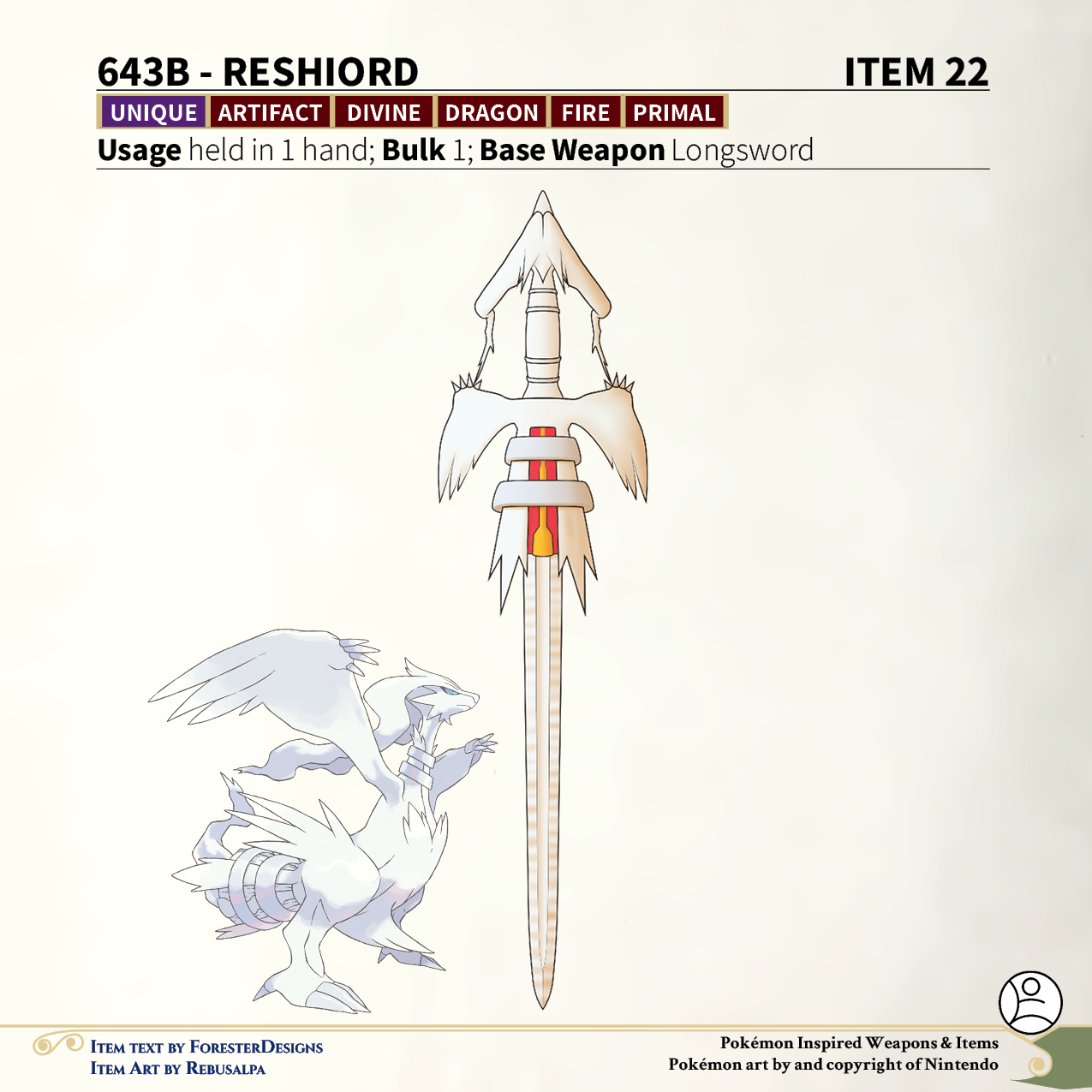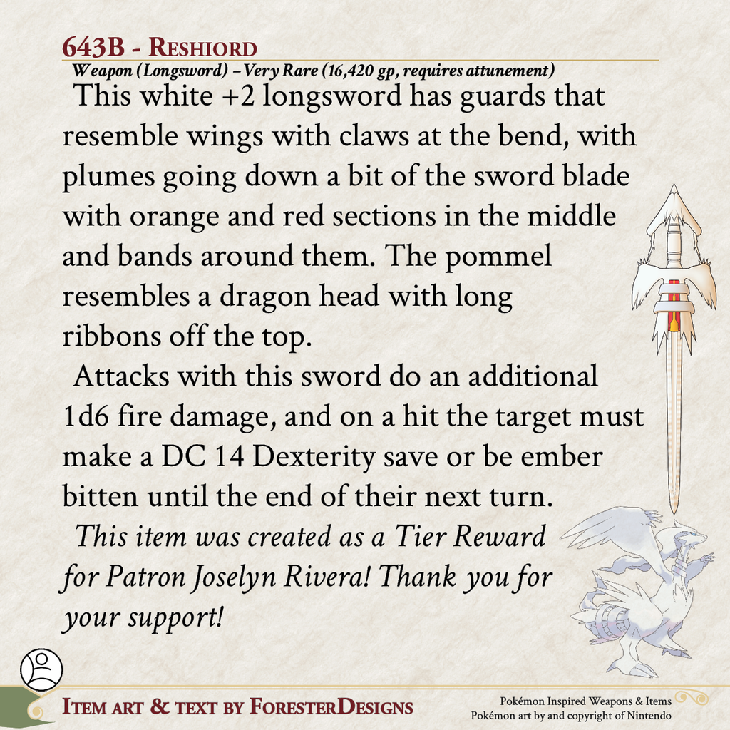 My #TTRPG #Pokemon #MagicItem of the Day in both #DnD and #PF2e, with a #Reshiram #sword to leave your enemies alight!
